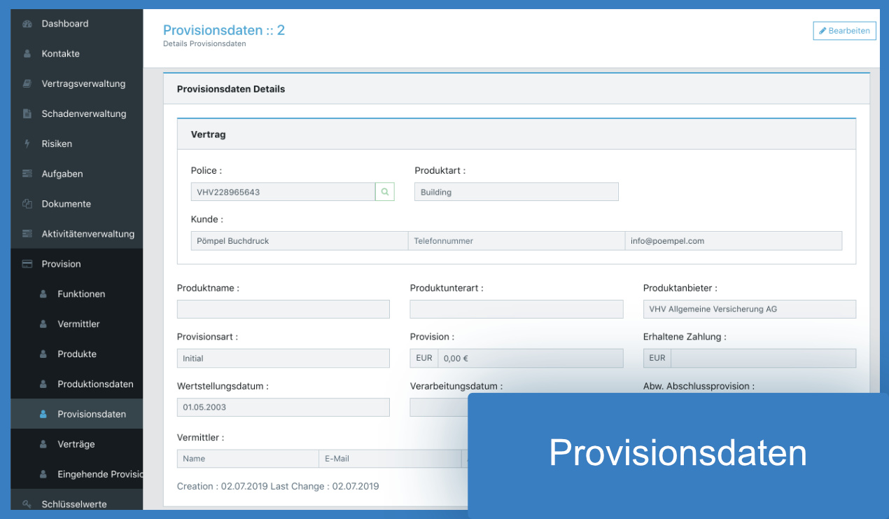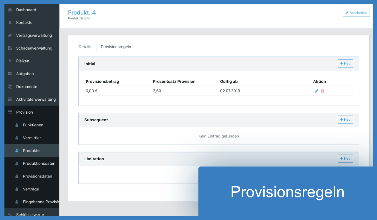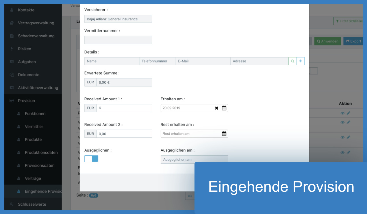 Im Provisionsmodul erfolgt die Berechnung Ihrer eingehenden Provisionen auf Basis der im System gepflegten Provisionsvereinbarungen für die verschiedenen Gesellschaften und Sparten. Zur Provisionskontrolle können die eingehenden Provisionen manuell ausgeglichen werden.