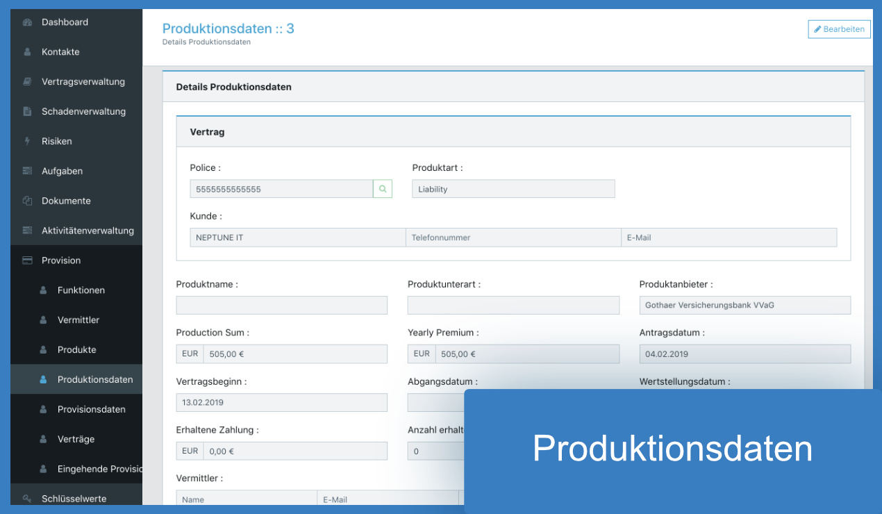 Neben der Provisionsdaten werden Produktionsdaten ermittelt die zur Erhebung von Statistiken dienen. Diese bieten die Möglichkeit zukünftiger Planung auf Basis des aktuellen Bestandsvolumens.
