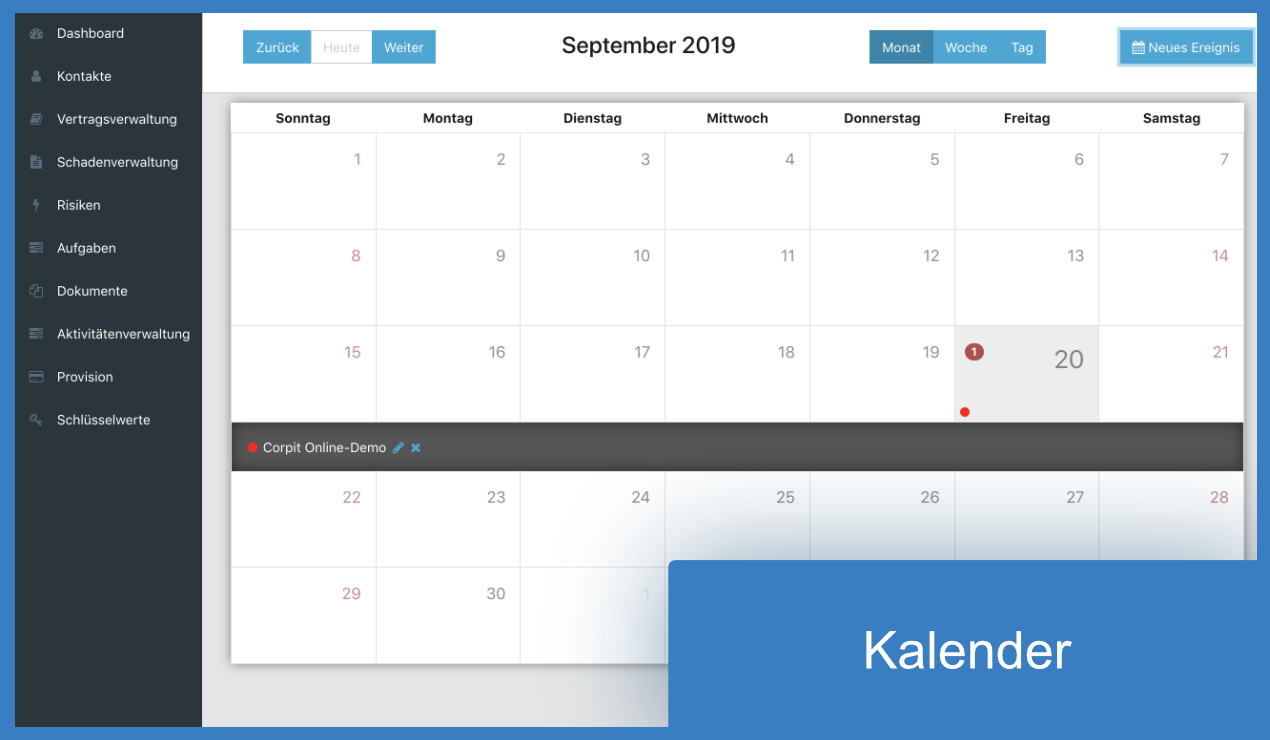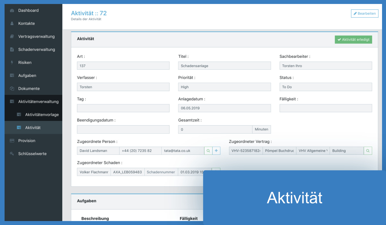 Für eine effiziente Organisation der Arbeitsabläufe stehen die Aktivitäten- und Aufgabenverwaltung zur Verfügung. Erstellen Sie Aufgaben und Aktivitäten und verknüpfen Sie diese direkt mit Kunden, Verträgen und Schäden.