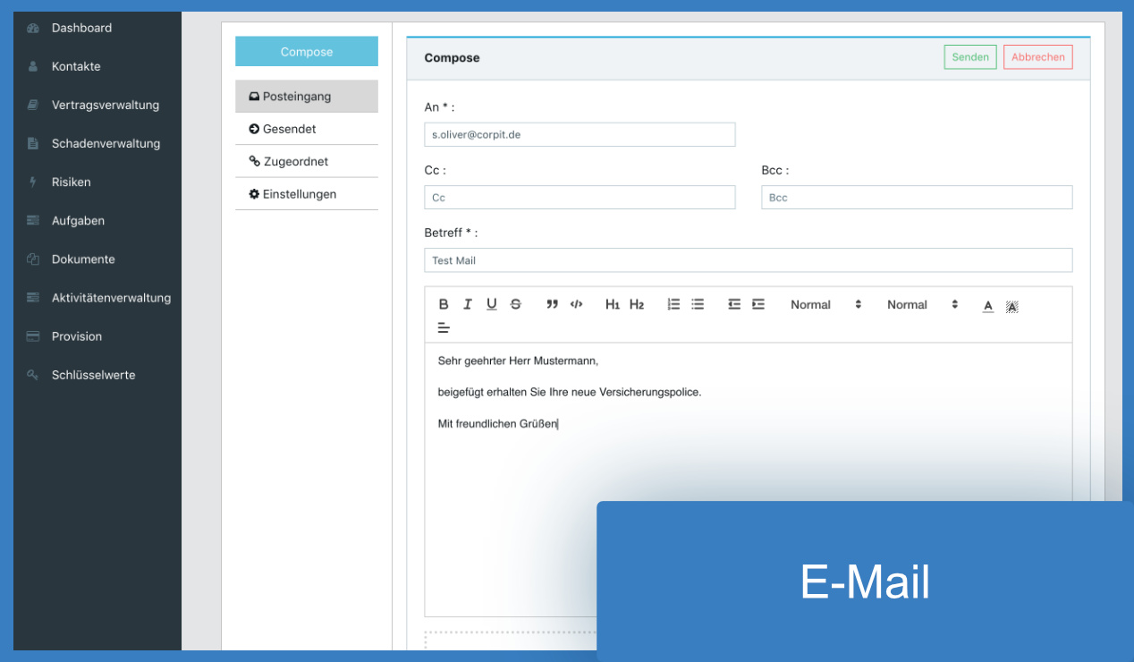 Ein systemeigener Email-Client steht zur Verfügung. Sie haben die Möglichkeit, Ihren Standard- Email-Account mit CORPIT zu synchronisieren und somit Emails direkt aus dem System zu versenden und zu empfangen.