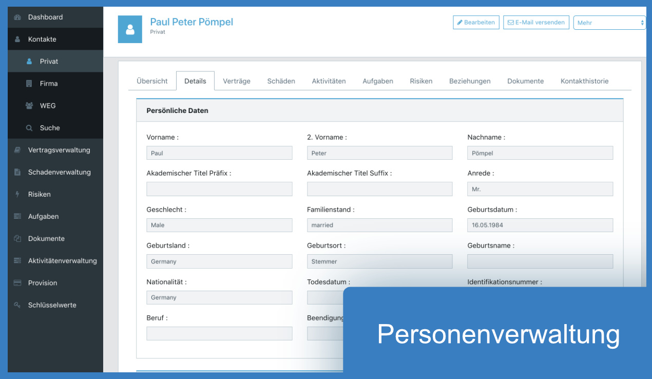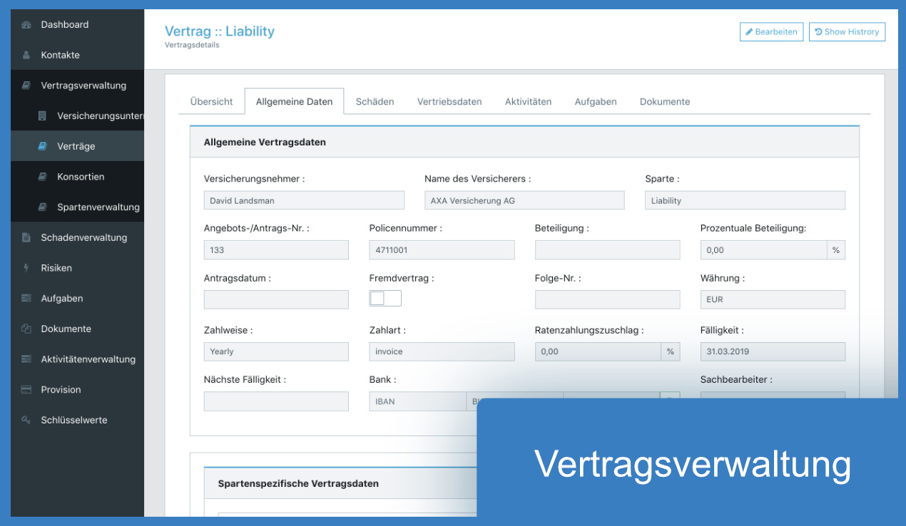 In der Vertragsverwaltung werden alle Informationen rund um Versicherungsverträge und Versicherungsgesellschaften verwaltet. Sie haben die Möglichkeit, Ihren Gesellschaften die relevanten Sparten zuzuordnen, Konsortien zu erstellen und Ihr Spartenportfolio zu managen. Die Vertragsmasken sind gegliedert in allgemeine Vertragsinformationen sowie spartenspezifische Vertragsinformationen. Diverse Wagnisse pro Sparte, mitversicherte Personen, gebündelte Verträge sowie Beteiligungsgeschäft können in übersichtlicher Form abgebildet werden.