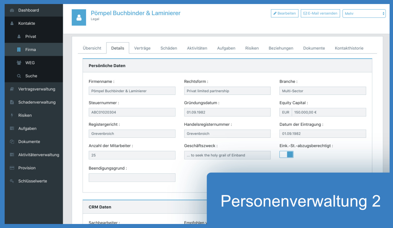 Das Herz der Anwendung ist das CRM-Modul. Es dient der Verwaltung des gesamten, für das System relevanten, Personenbestands. Es können Verknüpfungen von Personen hergestellt werden - sowohl familiäre Verbindungen von Privatpersonen untereinander als auch geschäftliche Verbindungen zu Firmen und von Firmen untereinander sind möglich.