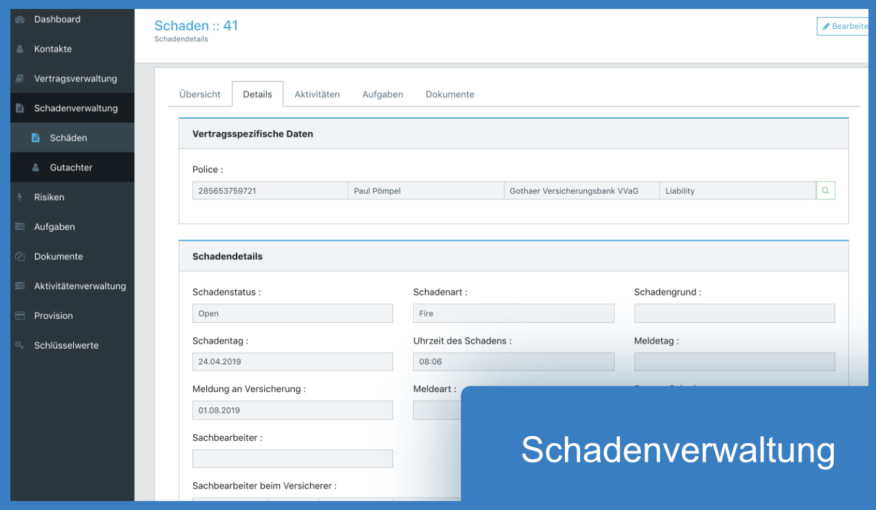 Im Schadenmodul haben Sie die Möglichkeit, die Schäden Ihrer Kunden zu verwalten. Neben Informationen zum Schadenhergang, diversen Schadenbeträge und Angaben zum Bearbeitungsstatus im Hinblick auf die Abwicklung des Schadens mit der Versicherungsgesellschaft werden auch Schadenbeteiligte und Gutachter hier zentral erfasst und verwaltet.